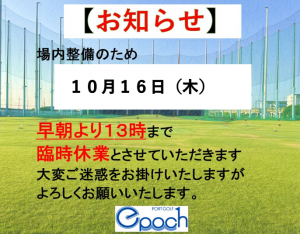 場内整備のため、9月4日(木)早朝から13時まで臨時休業